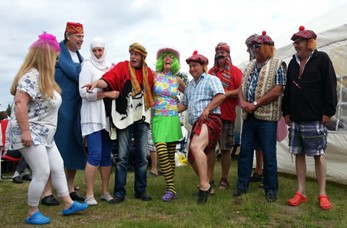 Alle var tilstede ved et kjempelangt toraders langbord, og vi hadde det aldeles fantastisk hyggelig! Tradisjonen tro var det pinseauksjon, og våre spinnville auksjonariuser Per og Jan Erik, fikk gapskratten til å slippe løs, igjen og igjen. En stor del av NBCC Vestfold Søndres økonomiske grunnlag legges på pinsetreffet, og auksjonen alene innbragte over 13000 kr. I tillegg dro finanskomiteen i gang julelotteriet, og ivrige loddkjøpere sto i kø! Så har vel de fleste av oss innsett at overskuddet kommer oss selv til gode i form av hygge, nytte og en og annen overraskelse til glede for alle. Ikke mindre enn to trekkspillere var med på treffet, og de spilte først til allsang med Jan som forsanger og deretter til dans. En del av deltagerne hadde med seg kostymer, og det dukket opp beduiner, skotter, cowboyer og lettkledde jenter med glitter og paljetter. Liv og røre og stor begeistring var hva vi observerte.