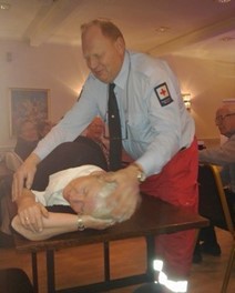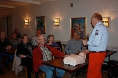 Stabilt sideleie ble demonstrert, likeså hjerte- lungeredning. Alle som ville fikk prøve seg på munn mot munn-metoden og hjertekompresjon på dukke. Flere prøvde, og syntes det var nyttig og det har de jo fullstendig rett i!!!