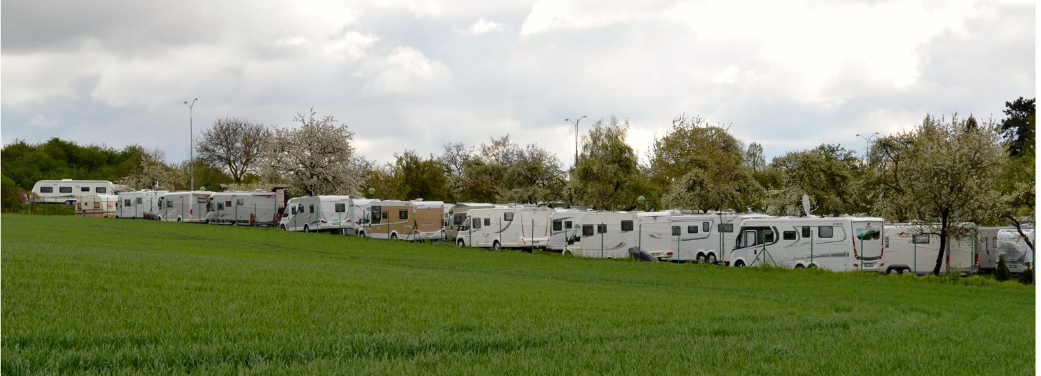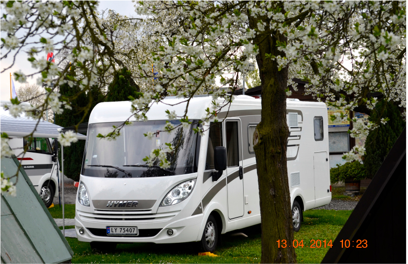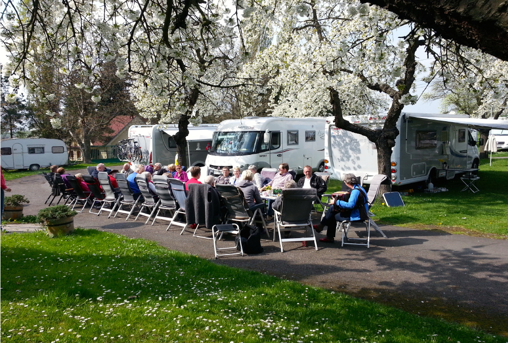 Det var et flott skue å se alle campingbilene under alle de hvitblomstrende frukttrærne.