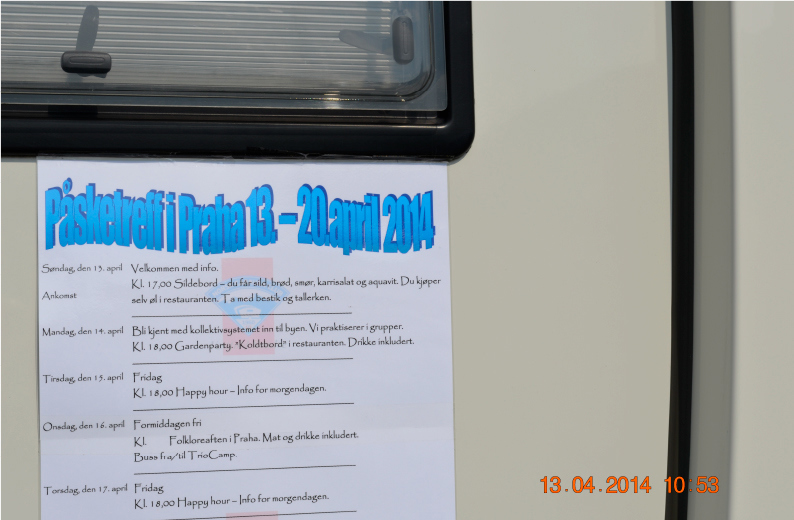 Siden vi var på vei sydover så vi for oss stigende temperaturer, og hadde tenkt å ta et par dager i Dresden, men da vi nærmet oss Muldal i Grimma falt temperaturen helt ned i 5 grader. Da bestemte vi oss for en kort lunch, litt bunkring og fortsette helt fram til Trio Camp i Praha.