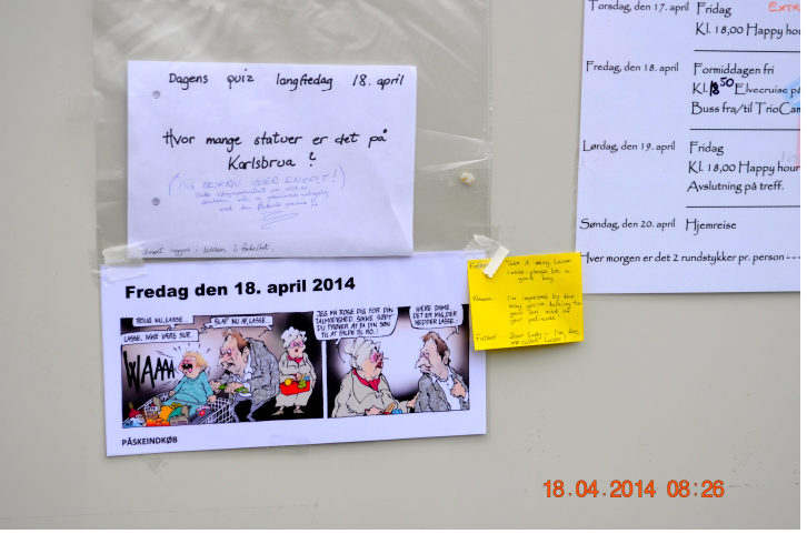 Søndag kl.1700 var det møte med info, utdeling av merker for rundstykker, drikke til ”Happy hour”, etterfulgt av et rikholdig sildebord med tilhørende aquavit.